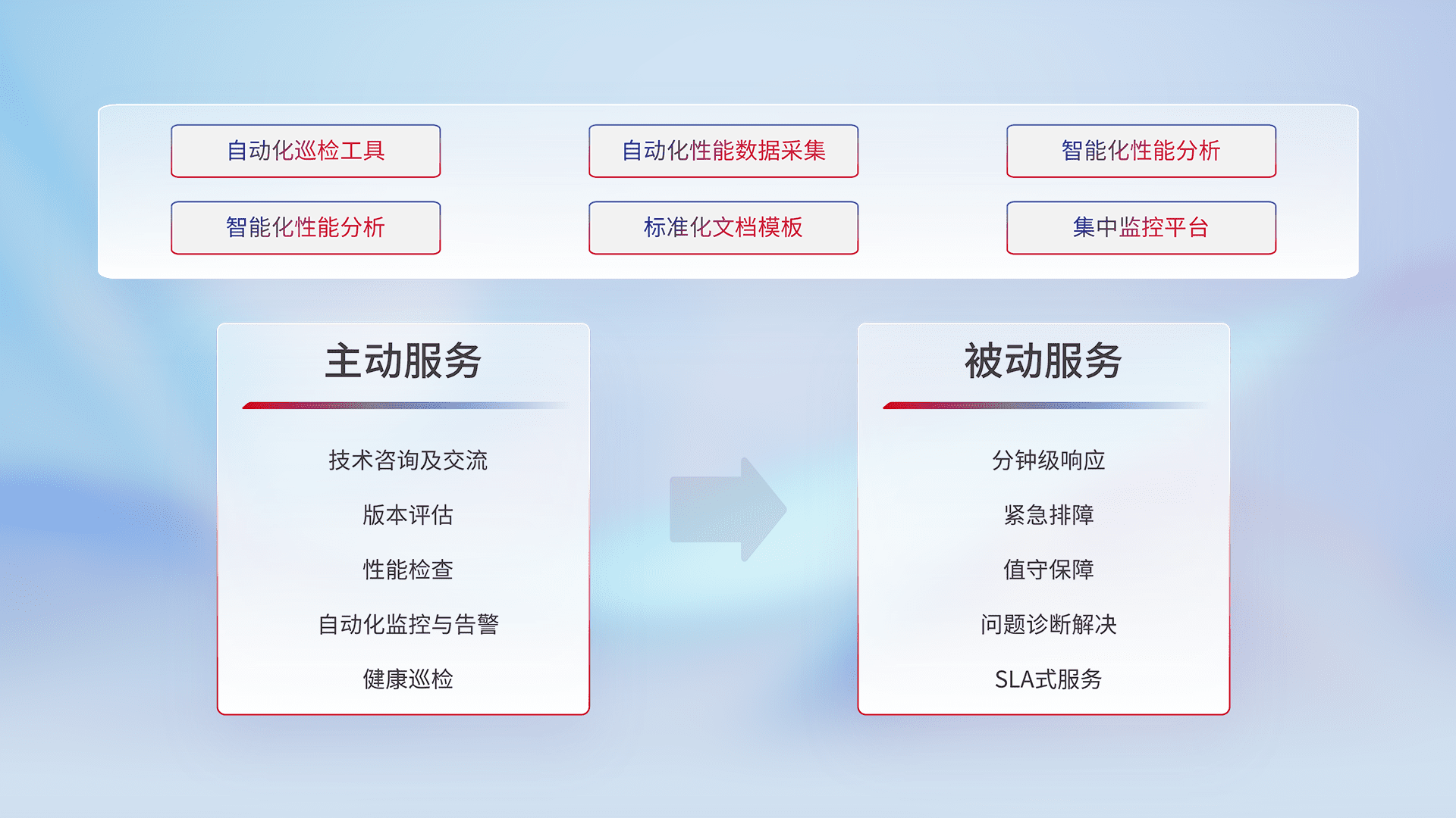 智能化工具和标准化文档,,,保障服务质量,,提供主动服务(包含技术咨询、、、版本评估、、性能检查、、、、自动化监控与告警、、、、健康巡检)和被动服务包含(分钟级响应、、、、紧急排障、、值守保障、、、、问题诊断解决、、、、SLA服务)。。。